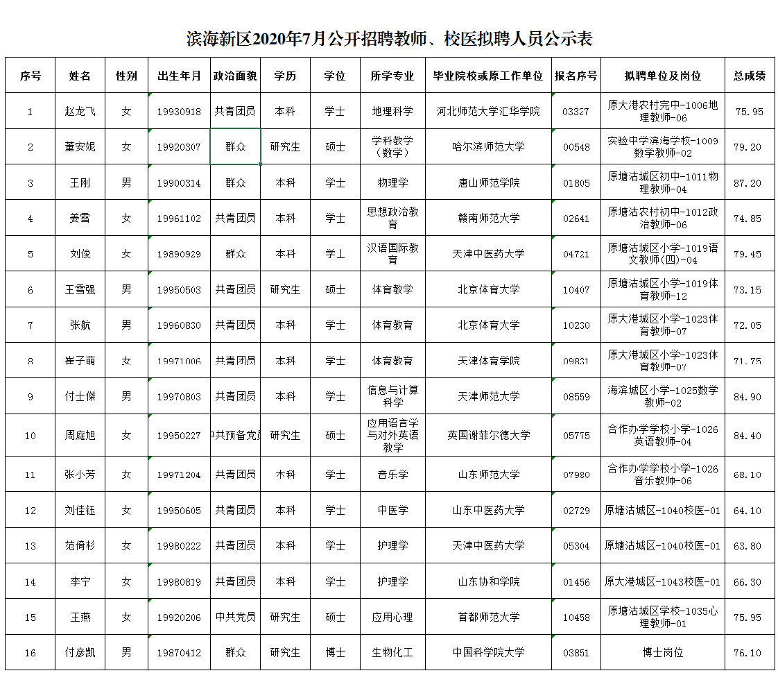 附件:滨海新区2020年7月公开招聘教师、校医拟聘人员公示表