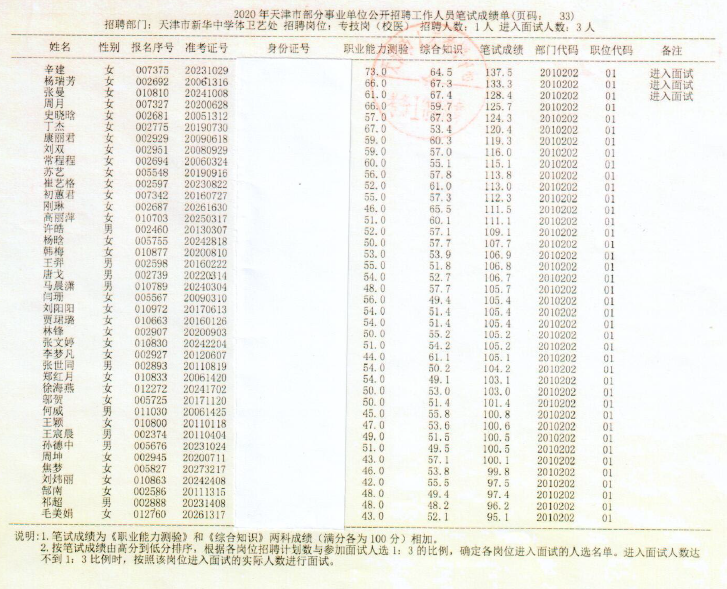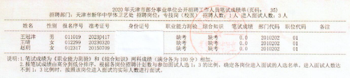 天津市新华中学2020年公开招聘校医笔试成绩公示
