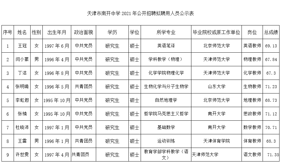 附件:天津市南开中学2021年公开招聘拟聘用人员公示表