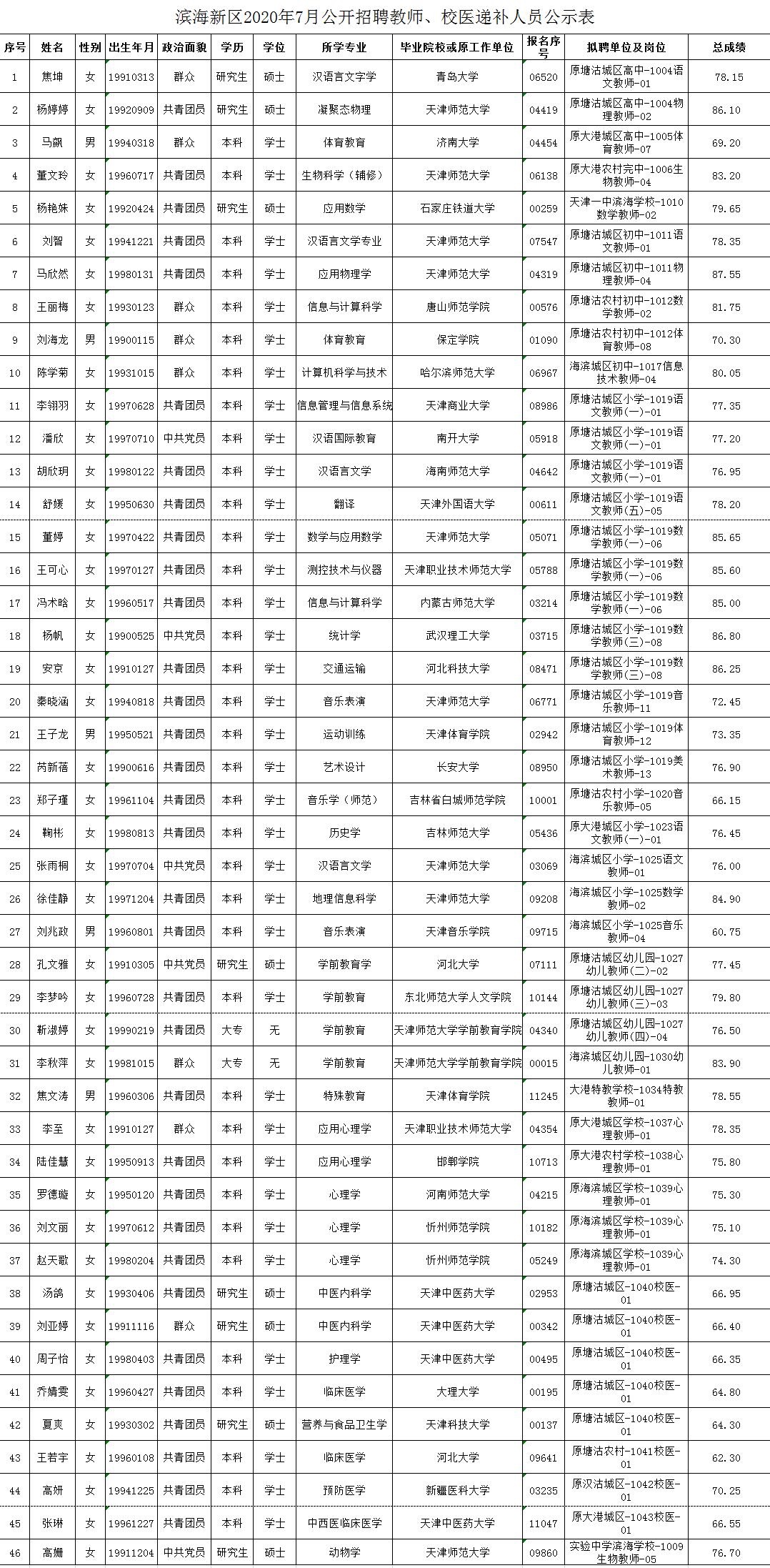 滨海新区2020年7月份公开招聘教师、校医递补人员公示