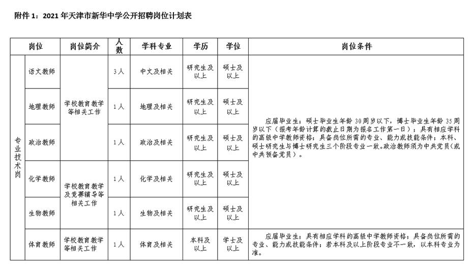 (三)各岗位具体报考条件见附件1《2021年天津市新华中学公开招聘岗位信息详表》。