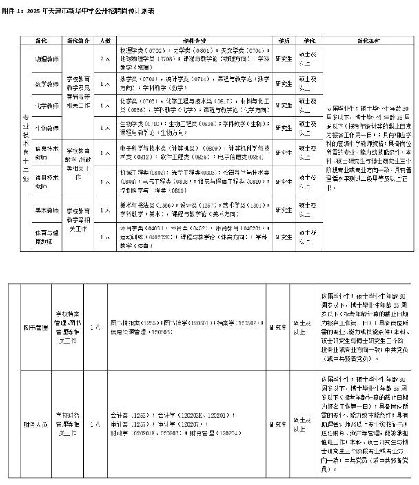 我校2025年拟招聘专业技术人员11名。具体岗位为中学物理教师2人,数学、化学、生物、信息技术、通用技术、美术、体育与健康教师各1人,图书管理1人,财务人员1人。详见附件1《2025年天津市新华中学公开招聘岗位计划表》。