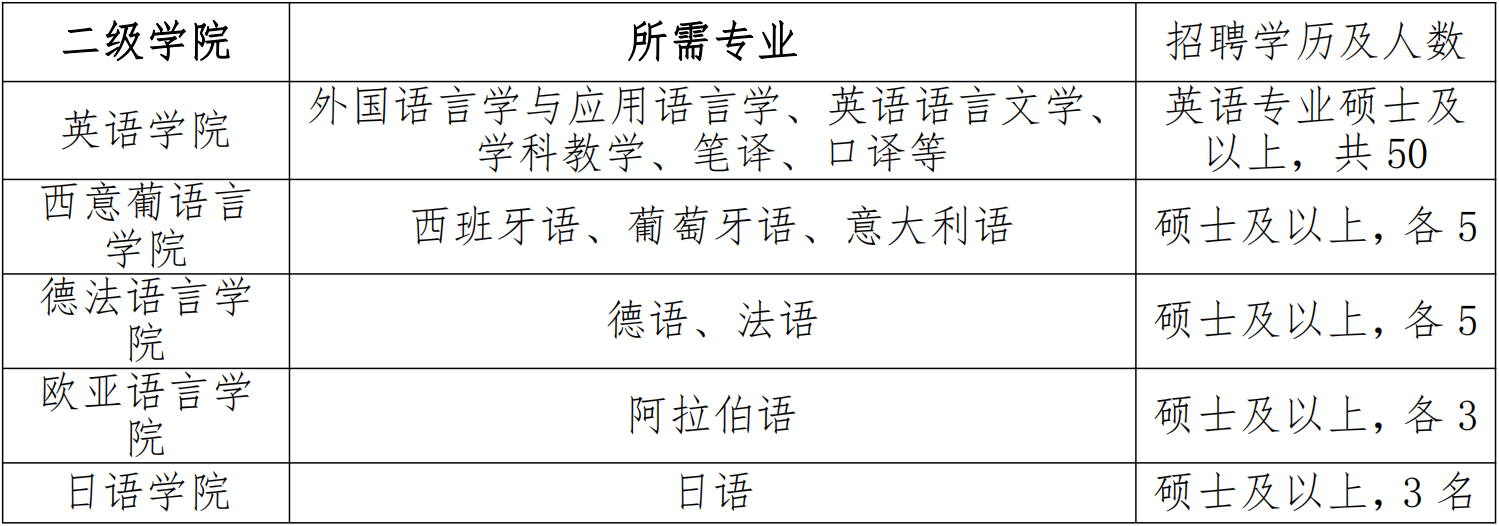 河北外国语学院作为河北省唯一一所独立建制的本科外国语大学。目前,河北外国语学院已与世界 82 个国家的 325 所大学开展着校际间本、硕、博层次合作,71 个语种覆盖欧洲、亚洲、非洲、大洋洲、南北美洲主要国家,语种数量位居全国高校第二位。136 个本专科专业涉及传媒、计算机、金融、建筑、商务商贸、教育、医护、交通旅游、艺术表演及外国文学十大领域。 河北外国语学院是国家5A 级民办高校,是教育部重点支持的 26 所民办本科高校之一,是国家援非工作的外语人才供应基地,是河北省人民政府批准的 10 所应用型重点本科试点高校,是省委省政府授予的“河北省招才引智十佳单位”。河北外国语学院为年轻教师打造了发展的平台,非常适合有志青年事业发展。为满足我校教学、科研工作需要,加快师资队伍建设步伐,我校 2020 年拟引进一批硕士毕业生,具体要求如下: