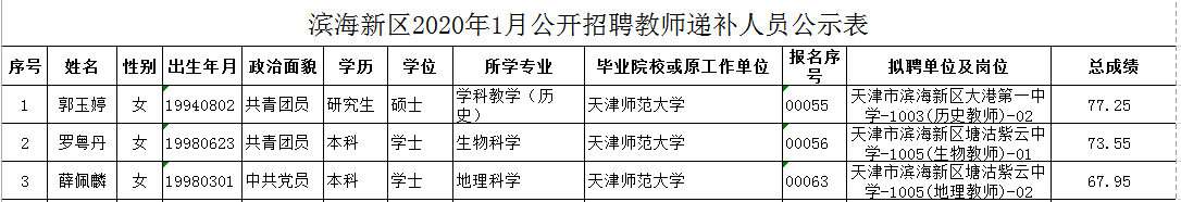 滨海新区2020年1月份公开招聘教师递补人员公示
