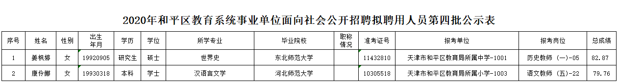 天津市和平区2020年教育系统事业单位面向社会公开招聘工作人员第四批公示
