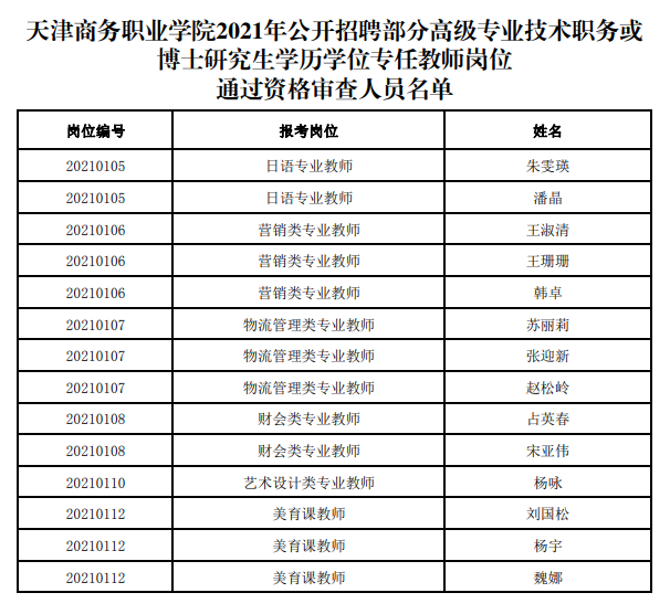 天津商务职业学院2021年公开招聘部分高级专业技术职务或博士研究生学历学位专任教师岗位通过资格审查人员名单