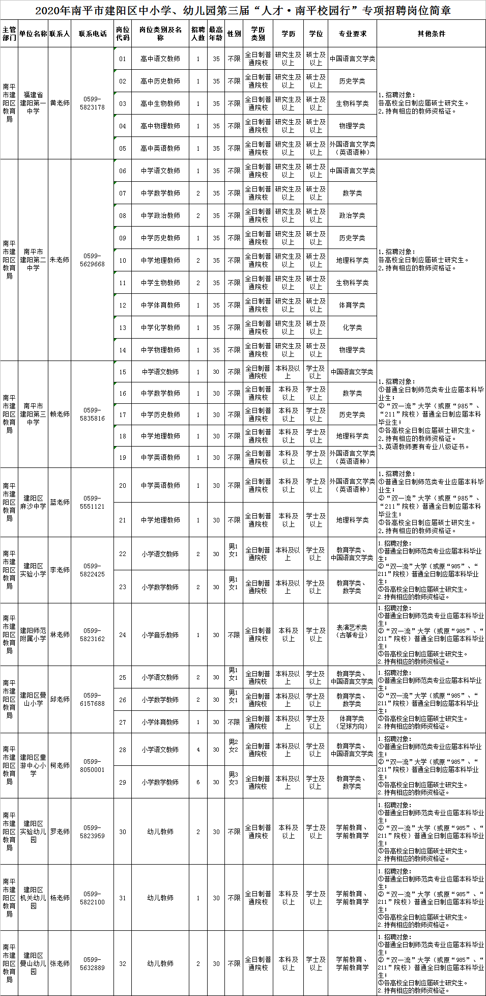 附件:1. 2020年南平市建阳区中小学、幼儿园第三届“人才·南平校园行”专项招聘岗位简章