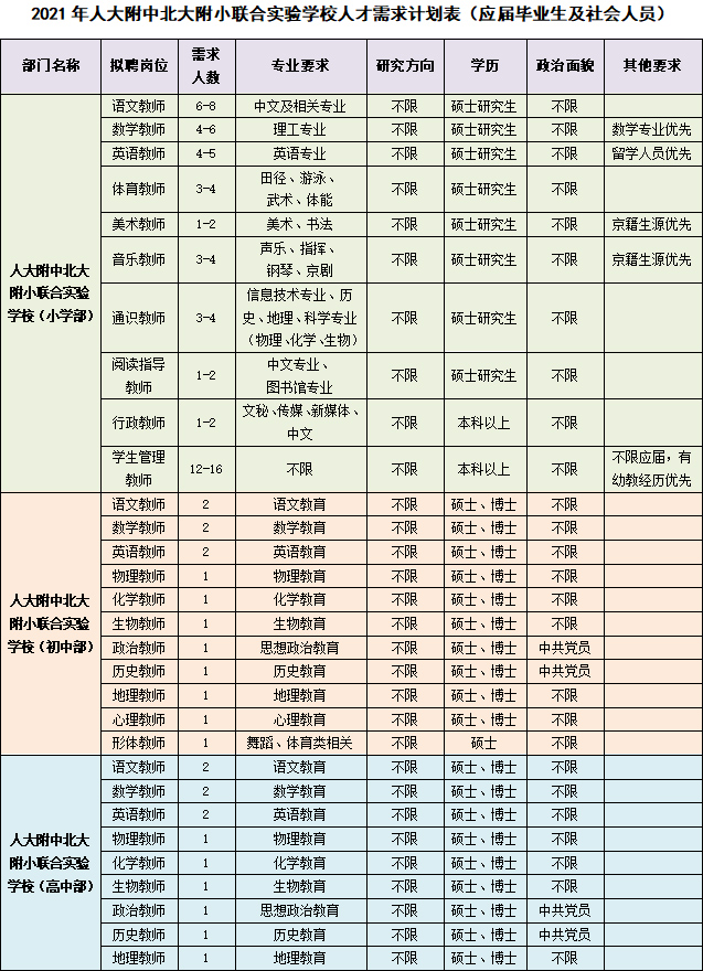 人大附中北大附小联合实验学校是一所12年一贯制民办公助性质的学校,学校的中学部由人大附中承办,小学部由北大附小承办,学校环境优美,设施一流。学校秉承科学先进的办学理念,以优异的办学成果赢得社会赞誉;以团结和谐的人文环境,为老师的发展提供良好条件。根据学校发展需要和人才队伍发展规划,现面向全国诚邀优秀教师加入学校工作。