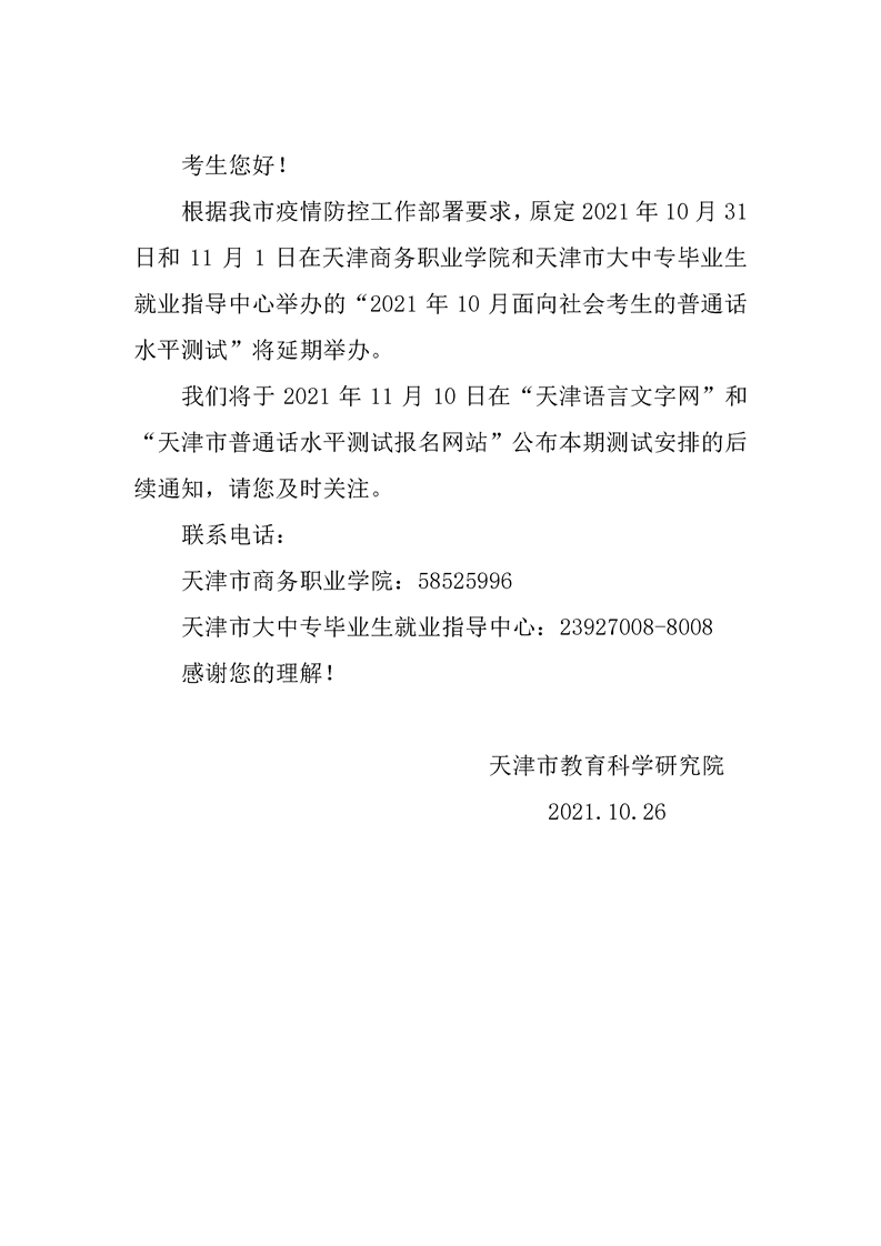 “2021年10月面向社会考生的普通话水平测试”延期举办的通知