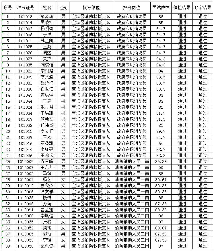 宝坻区消防救援支队招聘派遣制政府专职消防员和消防辅助人员拟招聘人员公示表