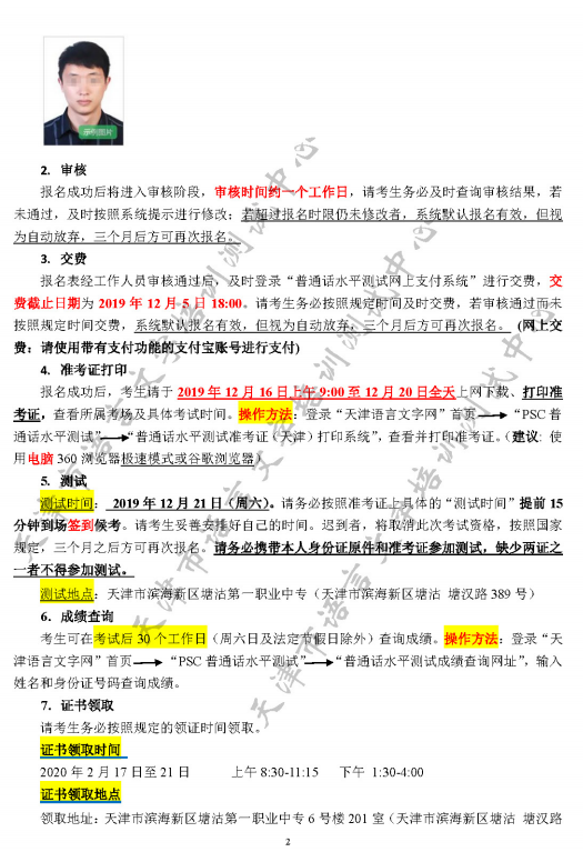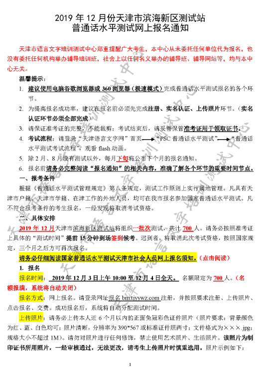 2019年12月份天津市滨海新区测试站普通话水平测试网上报名通知