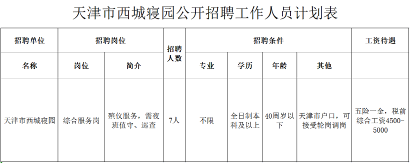 因天津市西城寝园发展需要,天津市西城寝园拟面向社会公开招聘综合服务岗7人现将有关事项公告如下: