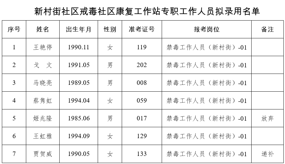 新村街社区戒毒社区康复工作站专职工作人员招聘拟聘用人员公示