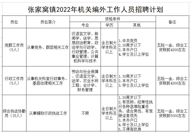 单位、岗位人数及资格条件等详见附件1《张家窝镇2022年机关编外工作人员招聘计划表》,应聘人员从2022年10月24日开始,可通过天津人才网(www.tjrenliziyuan.com)进行查询。
