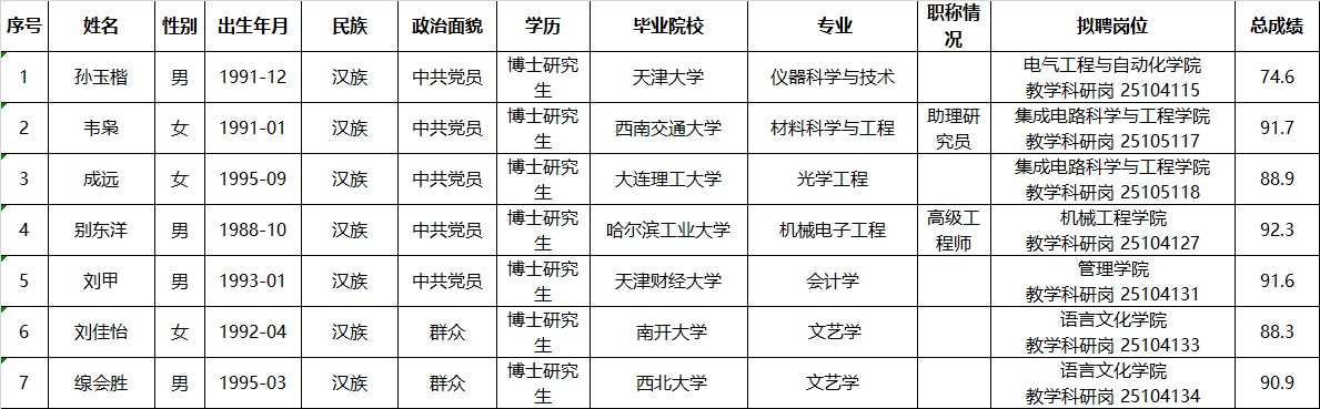 天津理工大学2025年公开招聘部分岗位拟聘人员公示