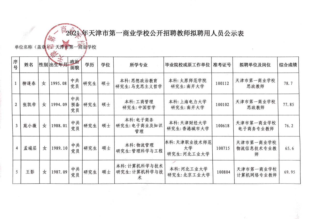 - 天津市第一商业学校公开招聘拟聘用人员公示