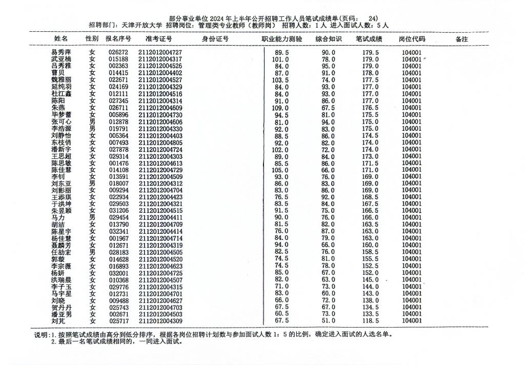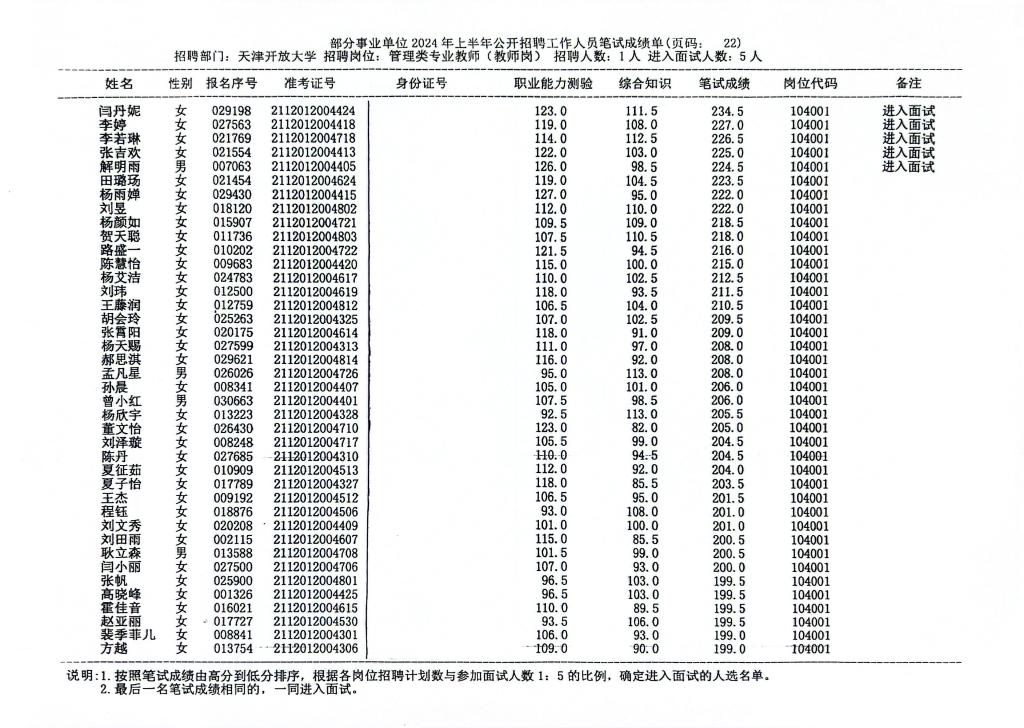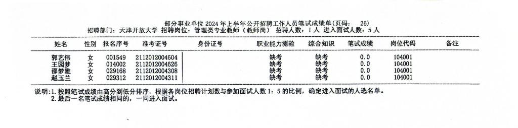 关于公布天津开放大学2024年第二批公开招聘笔试成绩的通知