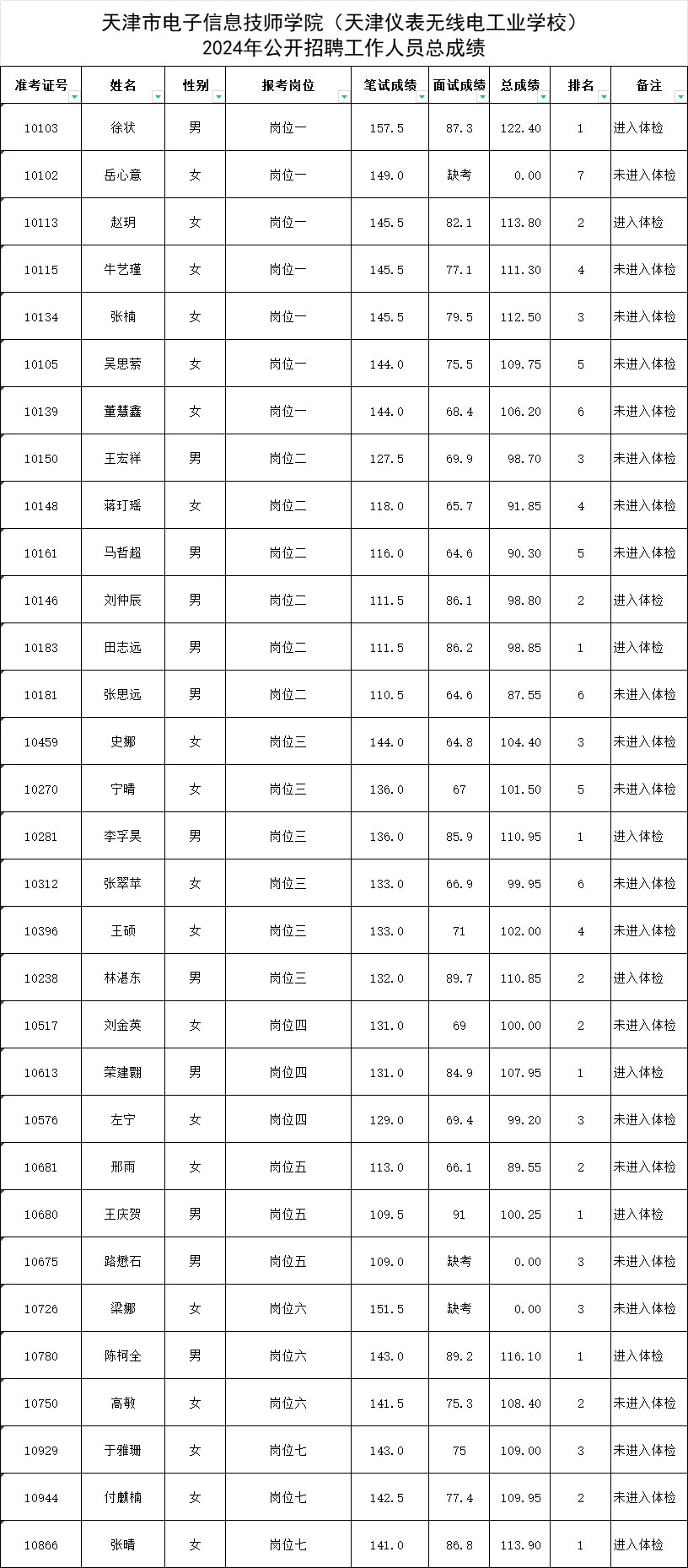 天津市电子信息技师学院(天津仪表无线电工业学校)2024年公开招聘工作人员总成绩