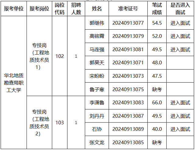 华北地质勘查局第四地质大队2024年第三批公开招聘工作人员笔试成绩