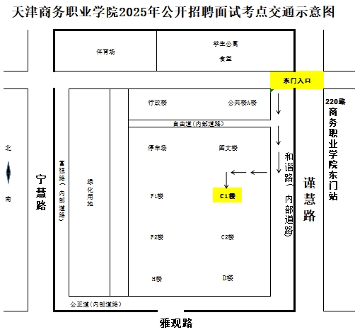 2.综合面试当天校内无法停放考生车辆,请从学校东北门(谨慧路、220路公交车商务职业学院东门站)步行入校。交通示意图如下: