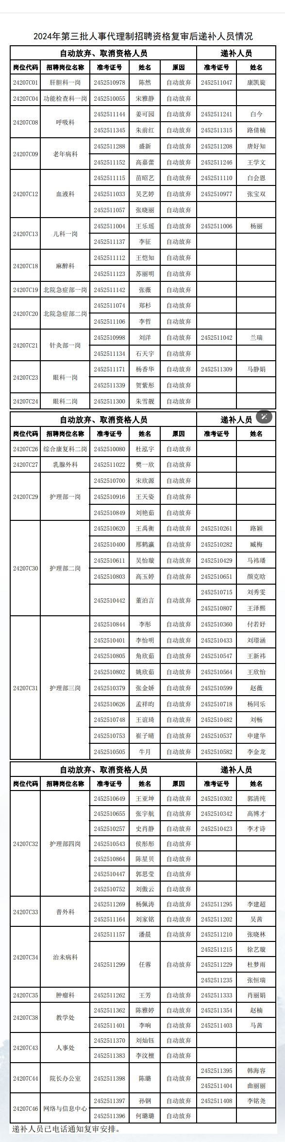 天津中医药大学第一附属医院2024年第三批人事代理制招聘资格复审后递补人员情况