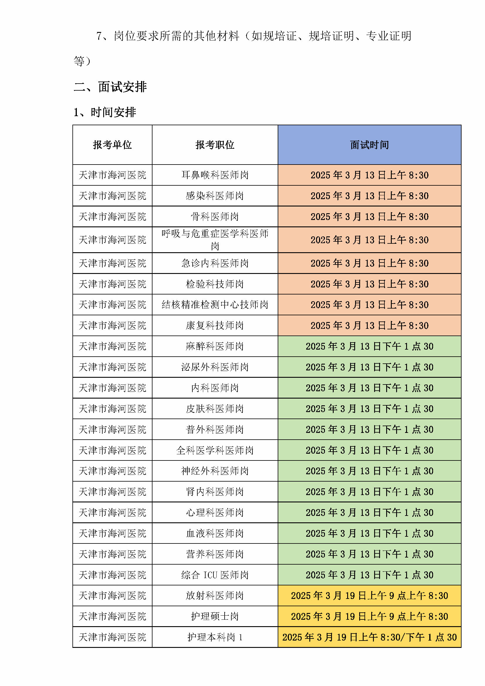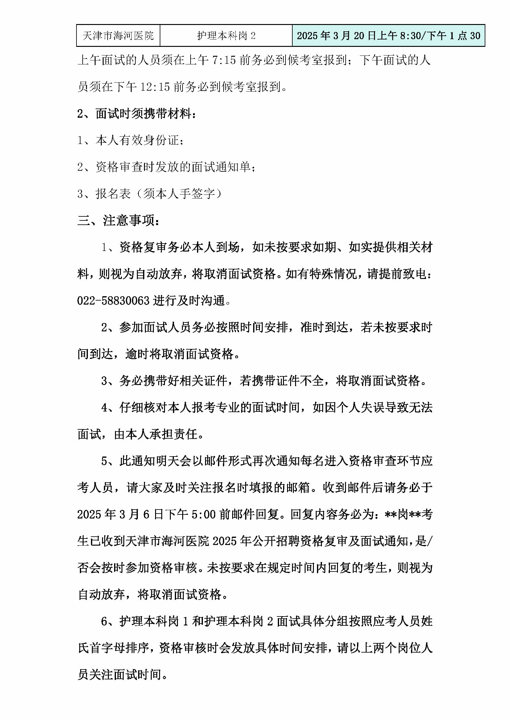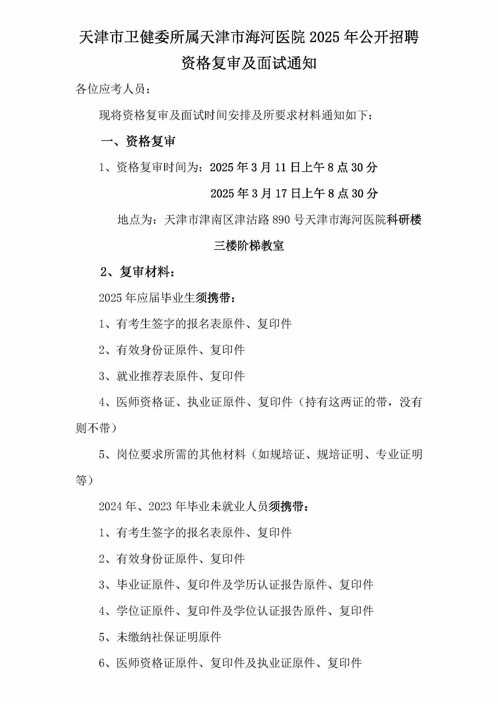 天津市卫健委所属天津市海河医院2025年公开招聘资格复审及面试通知