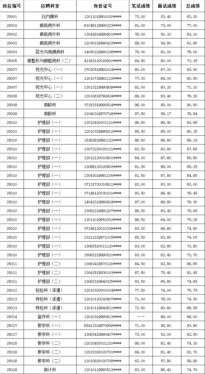 天津医科大学眼科医院2025年自主招聘面试成绩