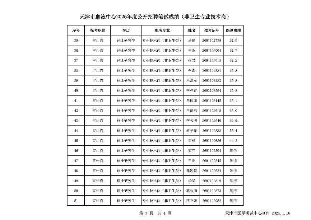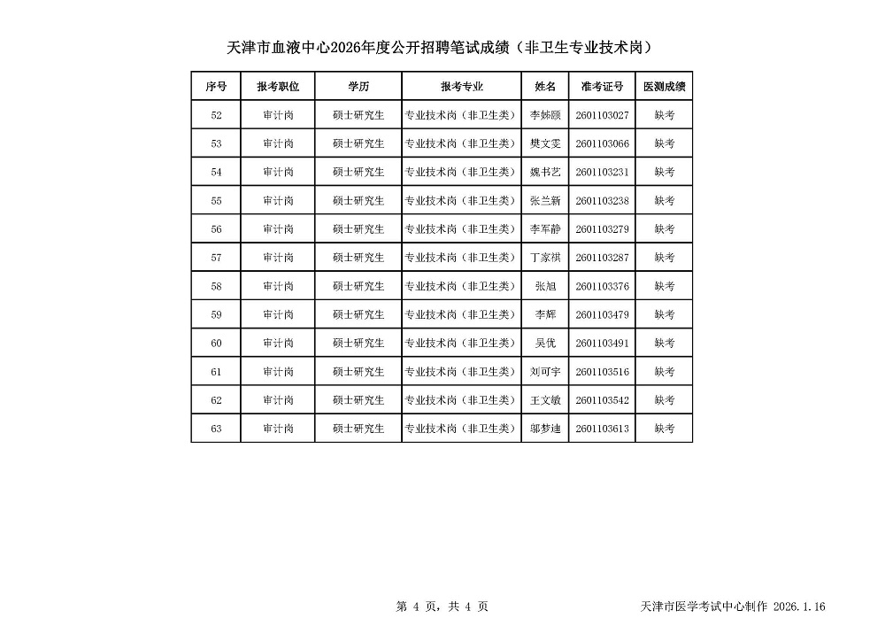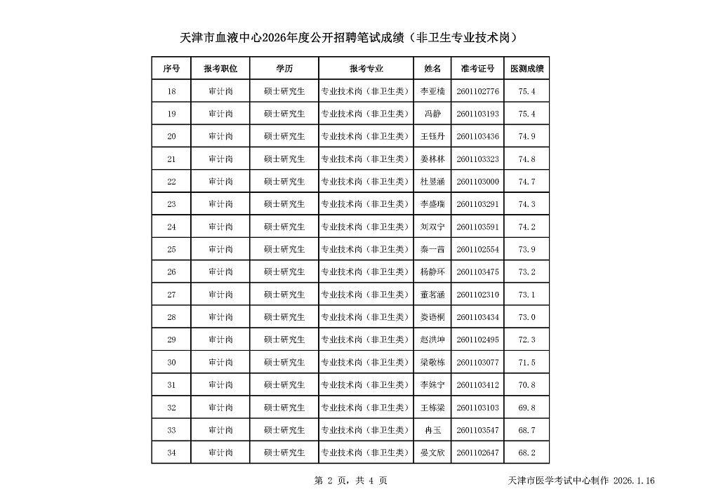 - 天津市第四中心医院2026年度公开招聘笔试成绩公示