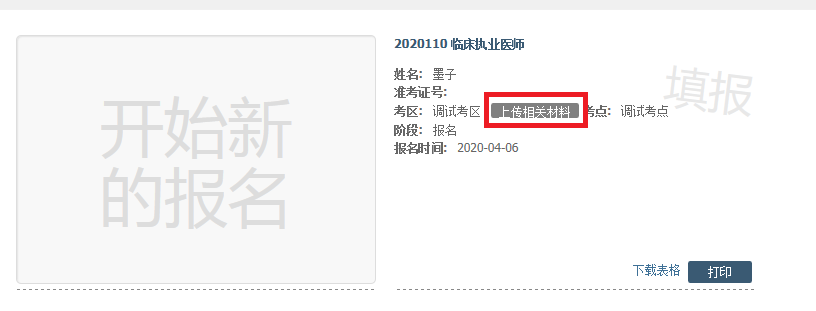 1.考生登录考试报名系统,在自己的报名界面点击上传相关材料;
