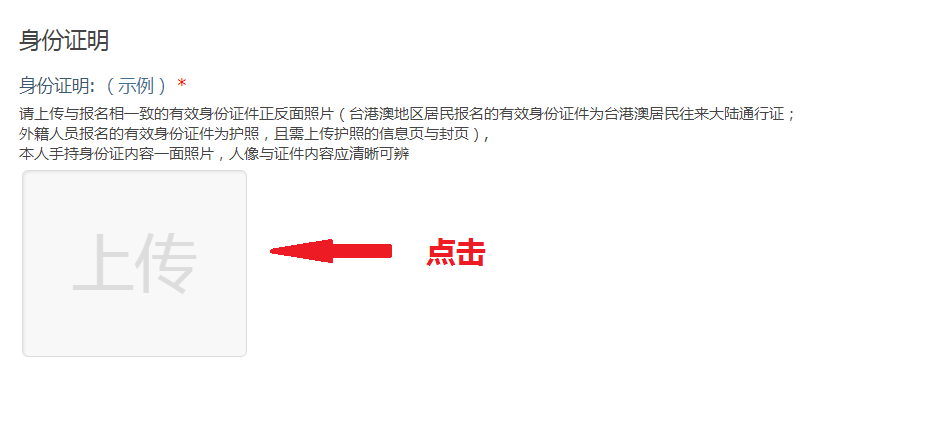 以身份证明上传为例,点击“示例”查看要求,再点“上传”按钮,进入上传图片界面,将个人已经准备好的图像文件上传。如下图: