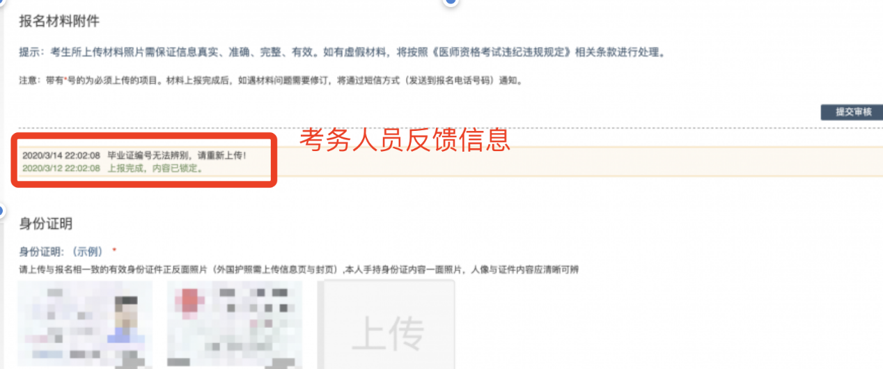 考生可根据考区要求的时间或通知,登陆上述上传页面查看您的医师资格考试报名材料审核反馈意见,并根据反馈意见补充完善相关材料。