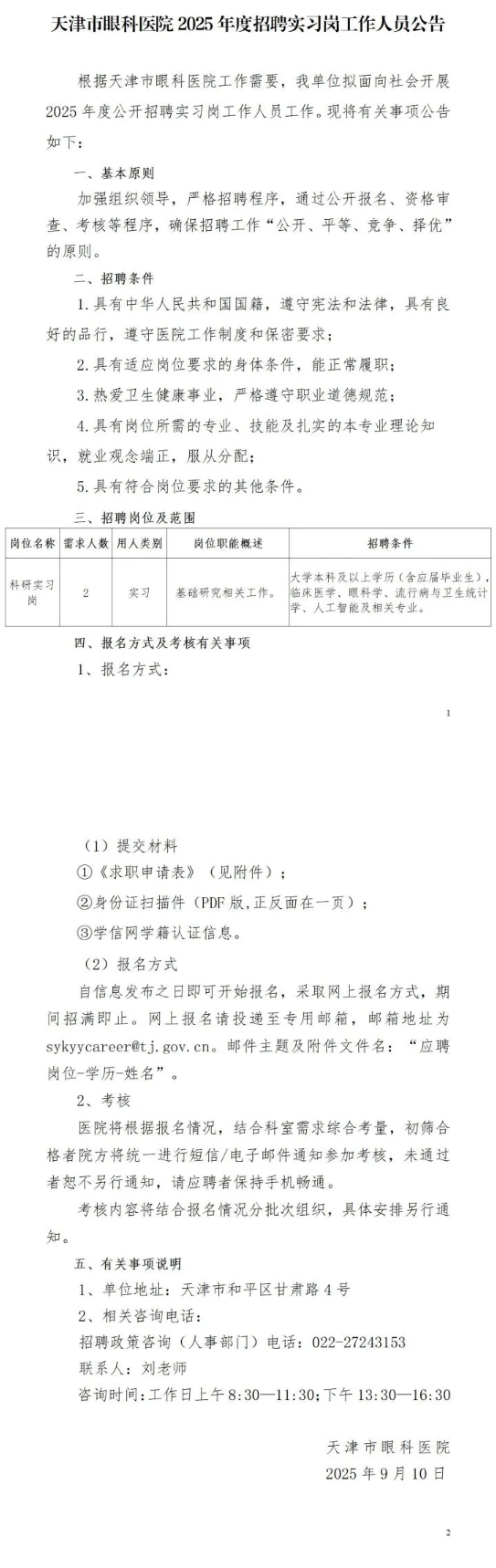 天津市眼科医院2025年度招聘实习岗工作人员公告