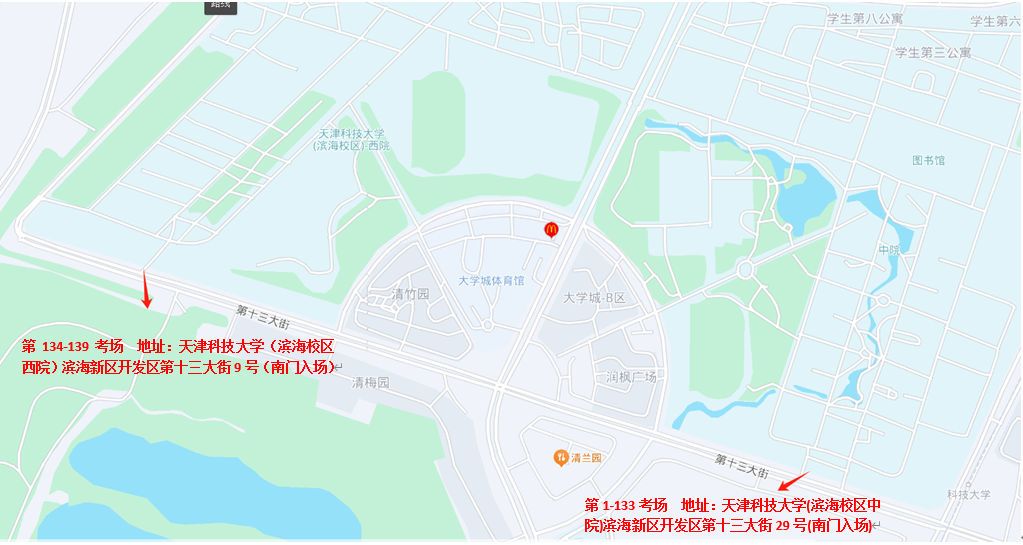按照天津市公安局滨海分局2025年面向社会公开招聘警务辅助人员工作的统一安排,定于7月12日(周六)组织考生进行笔试,现将有关事项通知如下: 一、笔试时间 2025年7月12日(周六)(具体时间详见准考证) 二、笔试地点(具体地点详见准考证) 第1-133考场 天津科技大学(滨海校区中院)滨海新区开发区第十三大街29号(南门入场) 第134-139考场 天津科技大学(滨海校区西院)滨海新区开发区第十三大街9号(南门入场) 三、重要提示 (一)考生须凭准考证、与报名时一致的有效身份证件原件(二代居民身份证、临时身份证明)进入规定考场,证件不全者不得参加考试。 (二)考生进入考场须携带考试文具,如2B铅笔、黑色字迹签字笔或钢笔、无封套橡皮等。不得携带书籍、资料、笔记本、自备草稿纸、食物、饮料以及手机、智能手表、智能手环、蓝牙耳机、计算器等各类具备通讯、摄录、收发信息、计算存储功能的电子设备和其他非考试物品。已携带入场,应按照要求存放在考场的指定位置(携带的各类具备通讯、摄录、收发信息、计算存储功能的电子设备需全部关闭后,再存放到指定位置)。 (三)未按准考证规定时间、地点参加笔试,视为自动放弃。 四、考场指引图