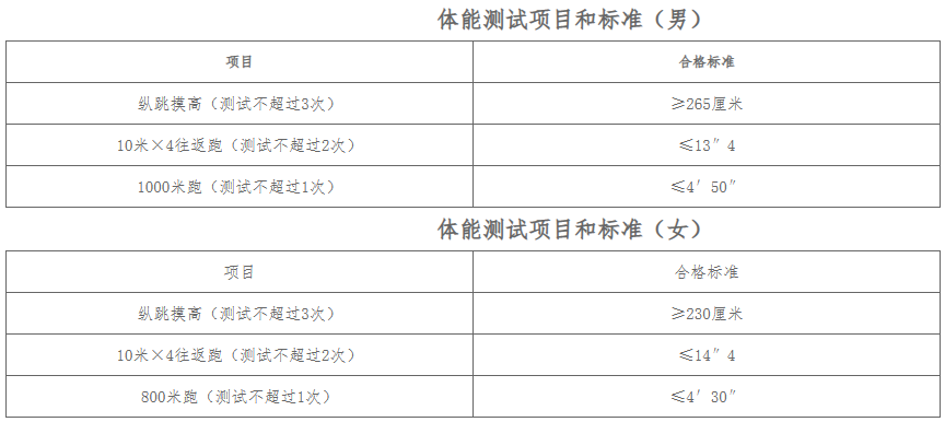具体时间、地点、要求以《体测通知单》为准,按照纵跳摸高、10米×4折返跑、1000米跑(800米跑)顺序进行。三项测试其中任意两项通过者视为合格,三项均须参加。
