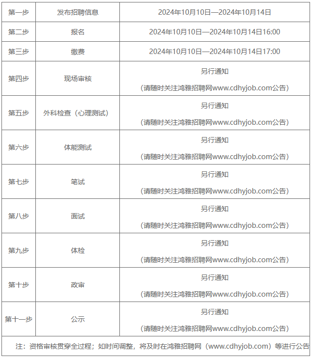 考生需按照公告要求参加体能测试,体能测试时间、地点及相关要求将在鸿雅招聘网(www.cdhyjob.com)进行公告,请考生随时关注。考生在鸿雅招聘网(www.cdhyjob.com)查询成绩并确认是否进入笔试环节。